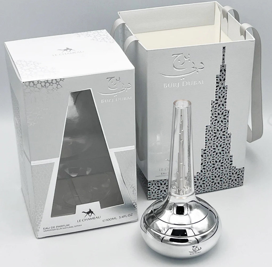 - El diseño de la botella y el empaque se inspiran en el icónico rascacielos Burj Khalifa y la opulencia de Dubái, con detalles como caligrafía árabe y patrones geométricos.